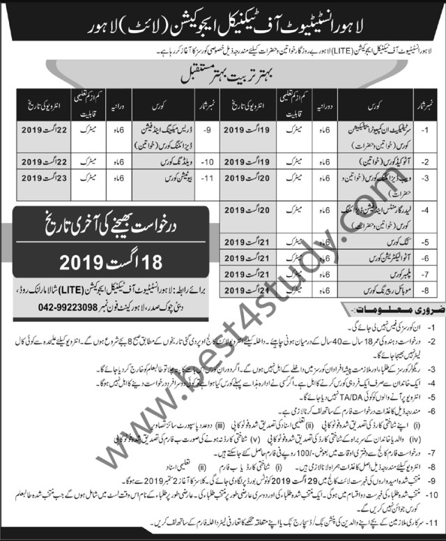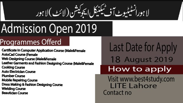 Lahore Institute of Technical Education (LITE) Lahore Admission Open for free Courses