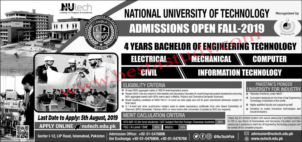 –Passed HSSC from any board of Intermediate and Secondary Education / A-level / foreign / equivalent examination securing 60% aggregate marks (with 60% marks each in Maths, Physics and Chemistry / 60% marks both in HSSC part-I and II when combined).