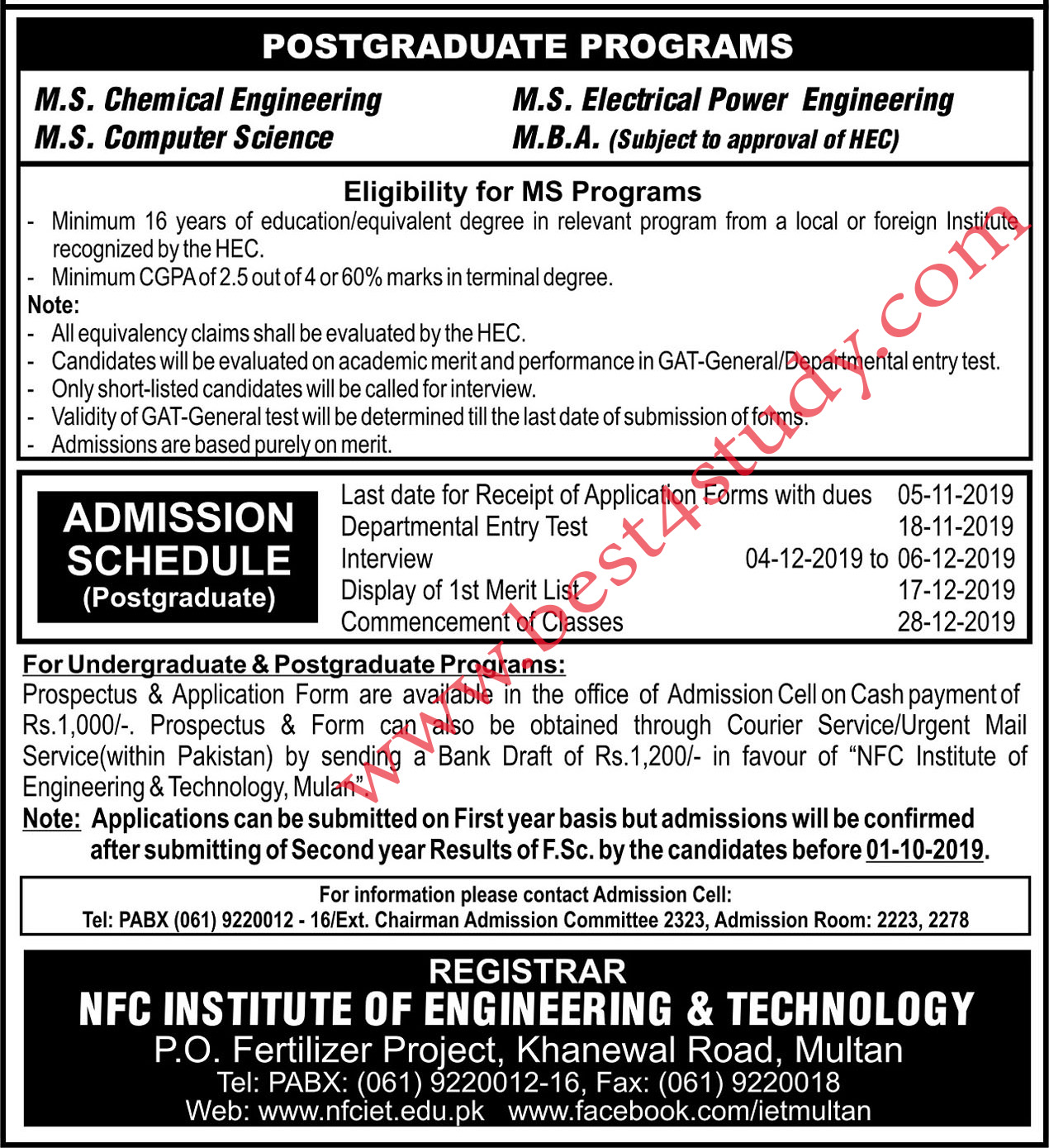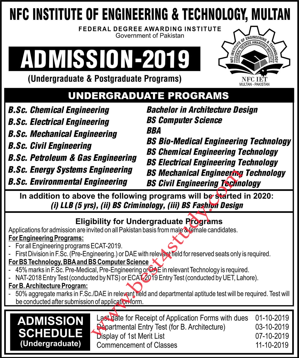 NFC Institute of Engineering & Technology , Multan Admission 2019 Registration