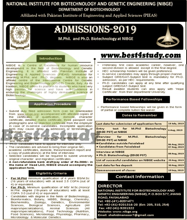 NIBGE is a Centre of Excellence for human resource development in the field of Biotechnology and Genetic Engineering. It is affiliated with Pakistan Institute of Engineering & Applied Sciences (PIEAS) Islamabad for awarding M.Phil. and Ph.D. degrees. NIBGE is also an affiliate centre of the International Centre for Genetic Engineering and Biotechnology (ICGEB) Trieste, Italy. As its tradition, NIBGE offers its platform to students who have very high passion for science and have self-confidence in enduring the challenges of highly demanding science of Biotechnology.