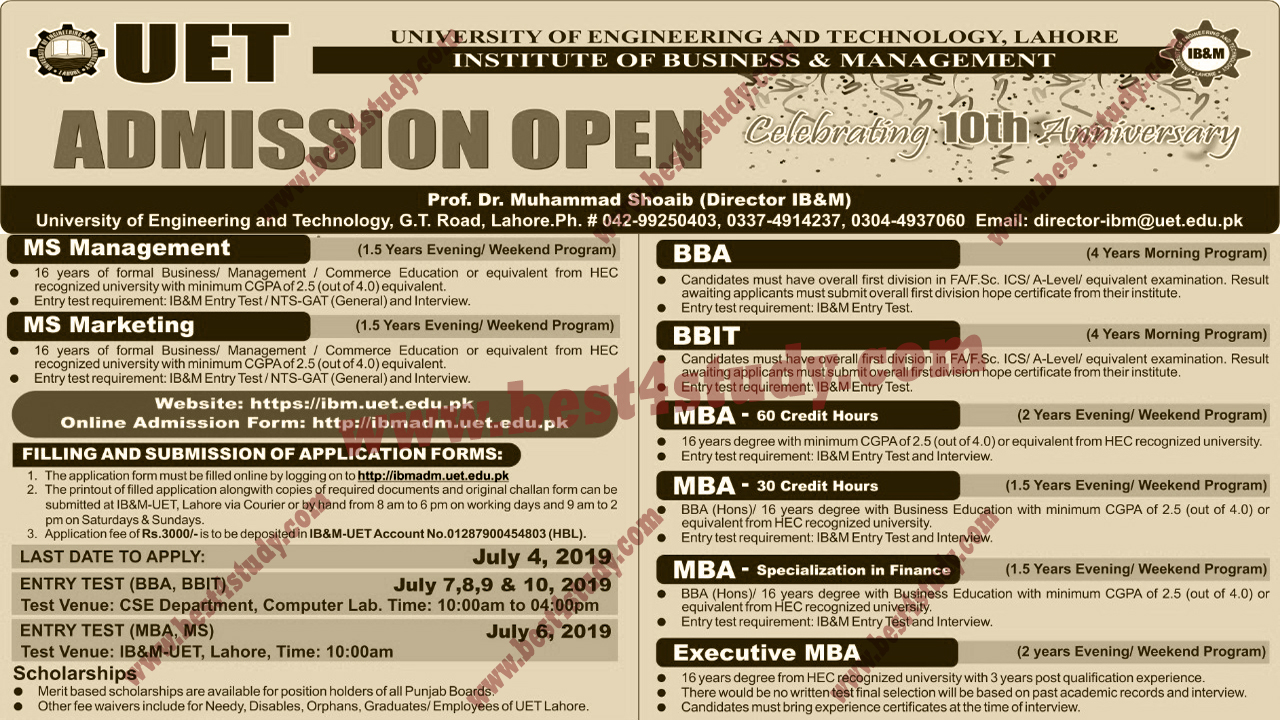 Institute of Business &Management-UET Lahore Admission Apply Online